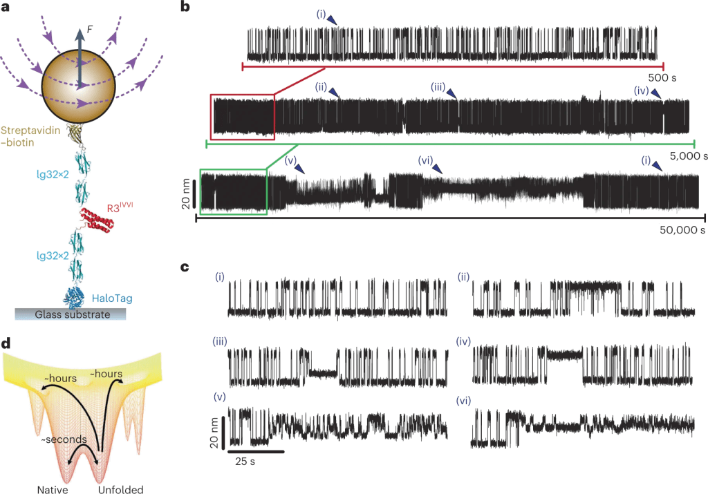 How proteins navigate their huge conformational space to reach and attain their folded, functional state remains one of the biggest mysteries in Biophysics. Recently, the classic static perception of protein structure has shifted towards a more dynamic view, where proteins can transit among several functional structures and, sometimes, fall into misfolded, kinetic traps, often underpinning diseases. Thanks to the outstanding stability of our magnetic tweezers approach, we aim to understand how proteins behave over long timescales, directly capturing the complexity of their landscapes.