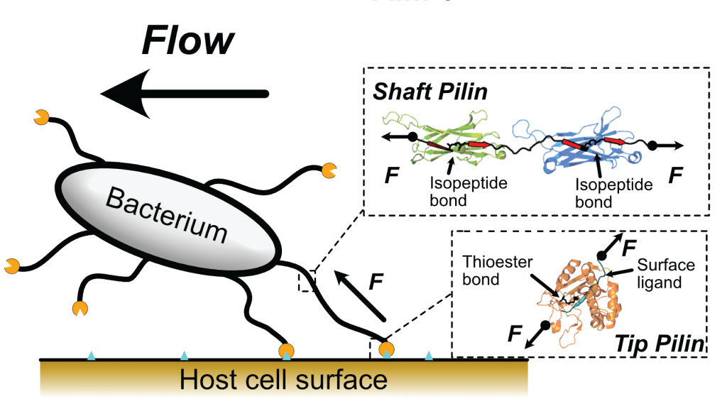 At the onset of an infection, bacteria adhere to host cells using their pili, which secure them against the formidable host defense mechanisms. Coughing, sneezing, or the mucus flow exert enormous mechanical forces aiming to detach the pilin anchors; however, bacterial pilin proteins have evolved smart chemical strategies that provide them with outstanding mechanical properties. We employ single-molecule techniques to unveil the chemical mechanisms underpinning pilin’s mechanical resilience, aiming at developing molecular strategies to interfere with bacterial adhesion.